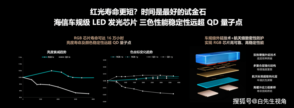 高画质≠高能耗,RGB-Mini LED三色背光发光效率拉满,不用额外补光,能耗比QD-OLED直接降30%。再靠光色同控算法精准控制每颗灯珠,杜绝无效能耗,长期用能省一大笔电费。海信旗下乾照光电还攻克了红色光源技术,红光寿命飙到16万小时,15年不褪色,比普通液晶电视耐用太多。