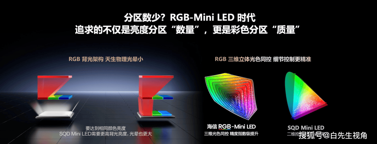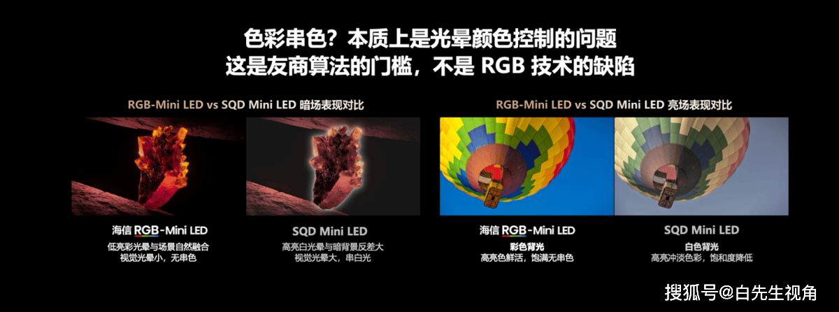 很多人以为RGB-Mini LED和SQD-Mini LED都是Mini LED,差距不大,其实压根是云泥之别!SQD-Mini LED只是单色背光的极端改良,为了高色域加厚色阻层,透光率跌30%,只能靠短波蓝光+大电流补光,最后色彩冲淡、光晕难控、能耗拉满,就是个顾此失彼的妥协方案,全球主流巨头都不跟进,市场认可度低到离谱。